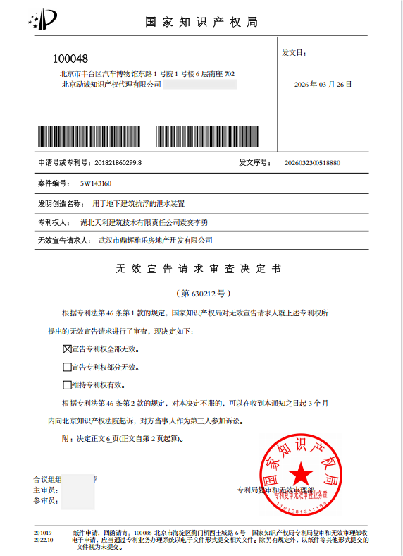 Recently, our firm prevailed in an invalidation proceeding for a utility model patent titled Drainage Device for Anti-floating of Underground Structures. The National Intellectual Property Administration (CNIPA) issued Examination Decision No. 630212, fully invalidating the patent (Patent No.: 201821860299.8).